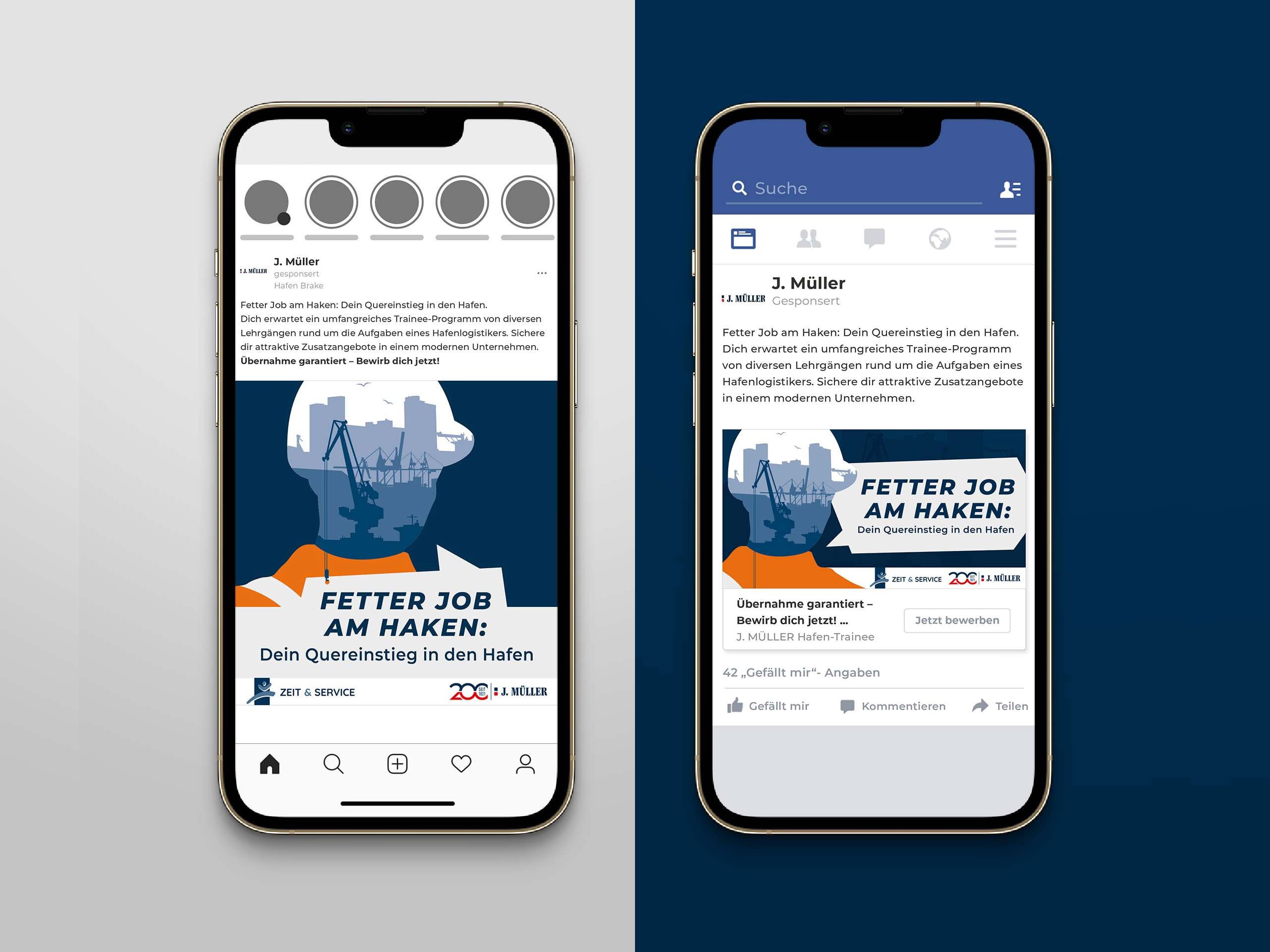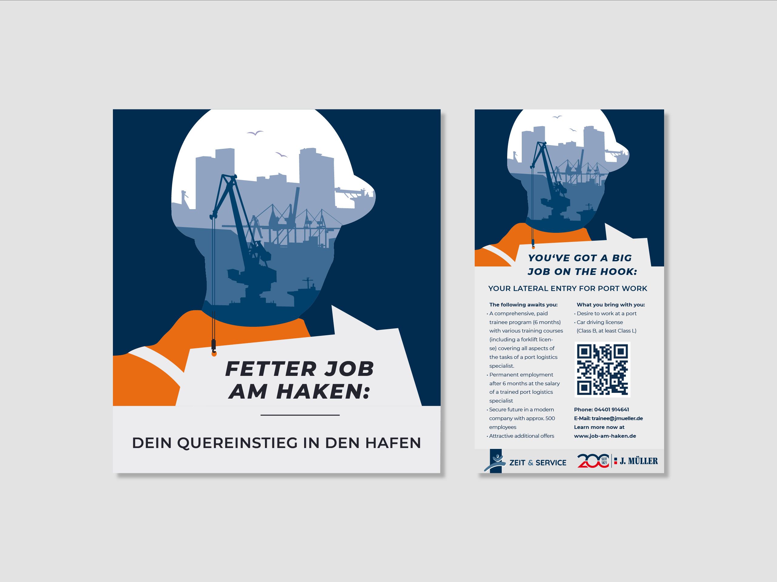 Während ein stilisiertes Mitarbeiterbild in einem schattenlosen und farblich unaufdringlichen, aber ansprechenden Stil für Filmposter-Feeling sorgt, vermittelt ein zweites, bildbasiertes Motiv mit Fokus auf echte Mitarbeiter Sympathie, Glaubwürdigkeit und Identifikation mit der beworbenen Tätigkeit.